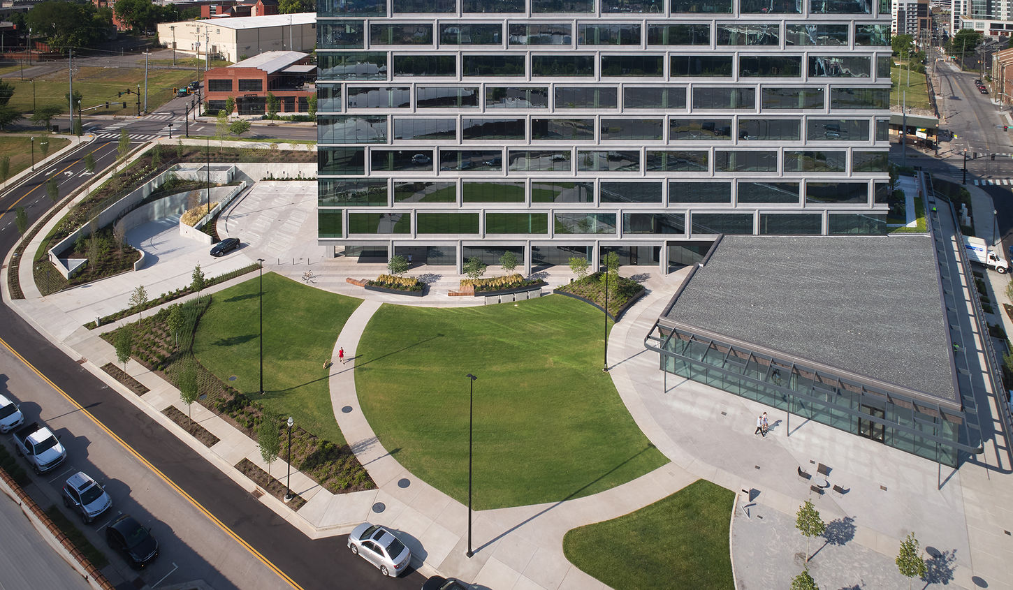 Continuing to re-imagine the traditional workplace, Hawkins Partners, Inc. (HPI) is honored to be among the talented team which brought to life the visionary mix-used office and community park design of Peabody Plaza. Positioned as a part of the Multi-staged Rolling Mill Hill Master Plan, Peabody Plaza draws on the rich history of the adjacent Trolley barns and gives way for the future in serving as a connector and gateway between the Cumberland Green Way and SoBro. The approximately .80 acre park, open to the public, sits atop a 1,005 space underground parking garage and includes access to outdoor work spaces, an outdoor Cafe, and two great-lawns.